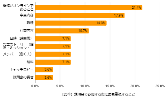 企業説明会へ参加する際に最も重視することをヒアリングしたところ、「オンライン開催であること」が最多だった23卒に対し(選考で求めるものも「WEB面談OK」が上位)、24卒は一貫して「仕事内容」と「事業内容」が約44.4%と上位に来ている。
