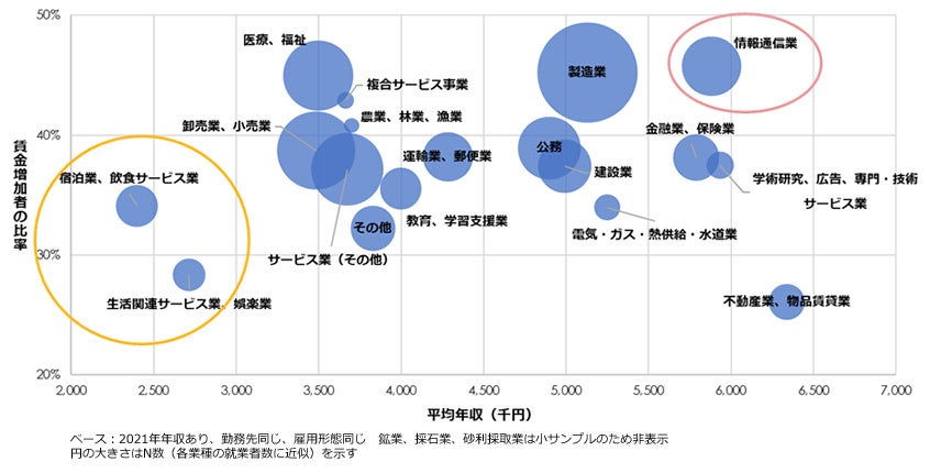 業種別に、「平均年収」と「前年からの賃金増加者(賃金が増加した人)の比率」の分布を見ると、「情報通信業」は平均年収が高く、賃金が増加した人の割合も多い。一方、「宿泊業、飲食サービス業」と「生活関連サービス業、娯楽業」は平均年収が低く、賃金が増加した人の割合も少ない傾向にある。
