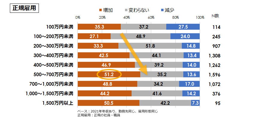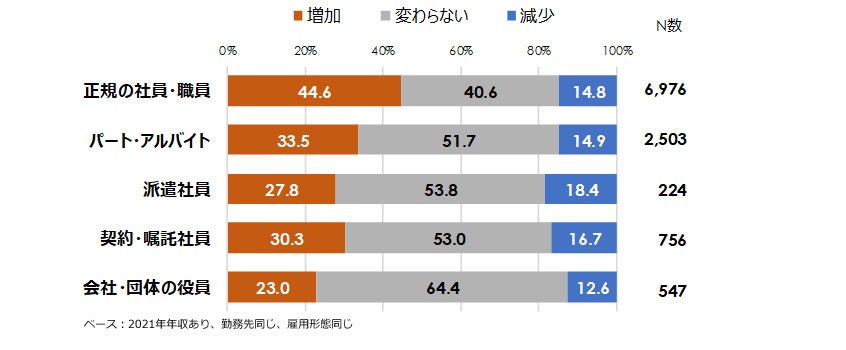 本調査は、全国の18~69歳で、2022年5月末現在、仕事から収入を得ている13,745人を対象に行った(自営業者・フリーランスを除く)。このうち勤務先と雇用形態が変わらなかった人に、前年(2021年)に比べ賃金がどのように変化したかを聞いたところ、「増加」と回答した人が最も多いのは「正規の社員・職員(44.6%)」であった。また、「パート・アルバイト(33.5%)」「派遣社員(27.8%)」「契約・嘱託社員(30.3%)」の非正規雇用者に比べて、正規雇用者のほうが、賃金が増加した人の割合が多かった。