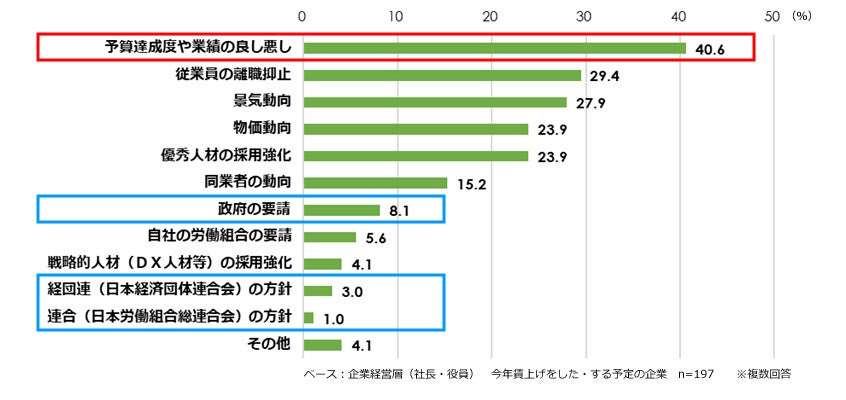 賃上げの判断に何が影響するかを聞いたところ、最も多かったのは「予算達成度や業績の良し悪し(40.6%)」であった。また、「物価動向(23.9%)」は、「景気動向(27.9%)」に次いで4番目に影響度の高い要素として挙がった。「政府の要請(8.1%)」や「経団連(3.0%)」、「連合(1.0%)」の方針は影響度が低かった。