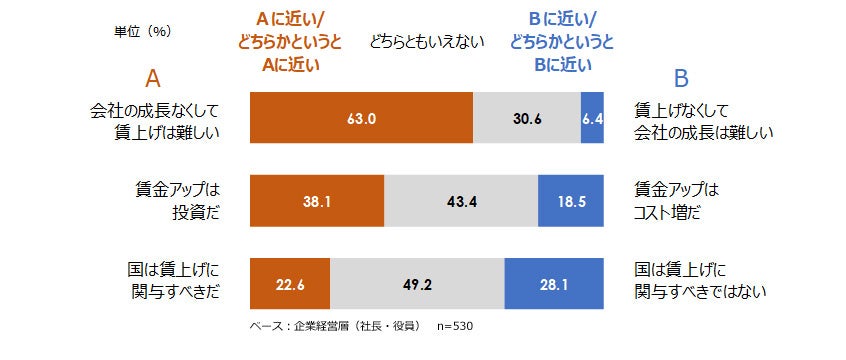 ここからは企業の経営層530人に対し、賃上げに対する考えや状況を聞いた結果である。 賃上げに関しては、企業の経営層の63.0%が「会社の成長なくして賃上げは難しい」と回答し、「賃上げなくして会社の成長は難しい」の6.4%を大きく上回った。一方で、「賃金アップは投資だ(38.1%)」は「賃金アップはコスト増だ(18.5%)」を20ポイントほど上回った。『賃上げには会社の成長が前提だが、成長への投資として賃上げも必要』と考える経営層の認識が読み取れる。