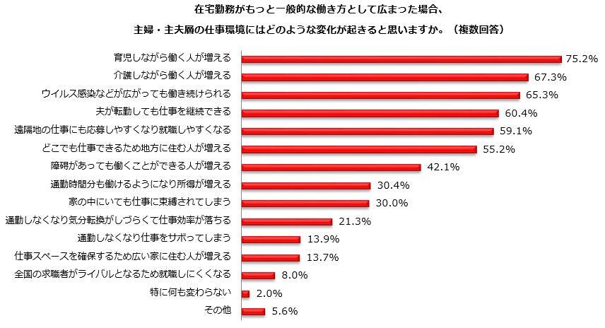 また、「在宅勤務がもっと一般的な働き方として広まった場合、主婦・主夫層の仕事環境にはどのような変化が起きると思いますか」との質問に対しては、「育児しながら働く人が増える」が最も多く75.2%、次いで「介護しながら働く人が増える」67.3%、「ウイルス感染などが広がっても働き続けられる」65.3%、「夫が転勤しても仕事を継続できる」60.4%、「遠隔地の仕事にも応募しやすくなり就職しやすくなる」59.1%と上位にポジティブな回答が続きました。