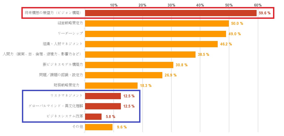 企業が実施・検討している強化テーマは「ビジョン構築」が最も多く、「経営戦略策定力」や「リーダーシップ」が続きます。次世代経営人材には、不確実性が高い時代において企業の未来を想像し、先導する力が求められるといえるでしょう。比べて、「リスクマネジメント」「グローバルマインド・異文化理解」「ビジネスシステム改革」などは実施・検討割合が低い結果となりました。
