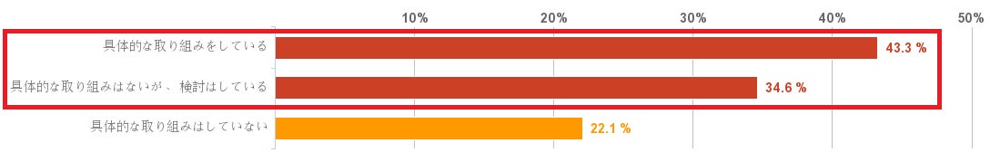 その一方で、「次世代経営人材の育成を目的とした取り組みの実施状況をお聞かせください」という設問では、43.3%が「具体的な取り組みをしている」と答え、34.6%が「具体的な取り組みはないが、検討はしている」と答えました。いずれの企業も喫緊の課題として取り組んでいる様子が伺えます。