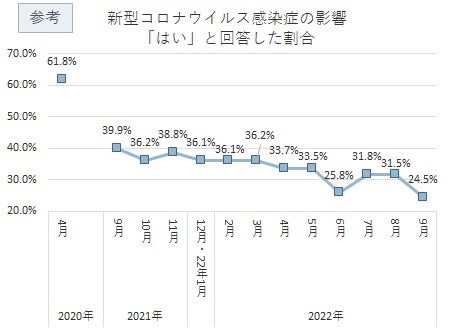 全体で24.5%が「はい」と回答し、新型コロナウイルス感染症の影響を受けて仕事探しをしていた割合は全体の四分の一程度となった。調査以来、最も低い割合となった。