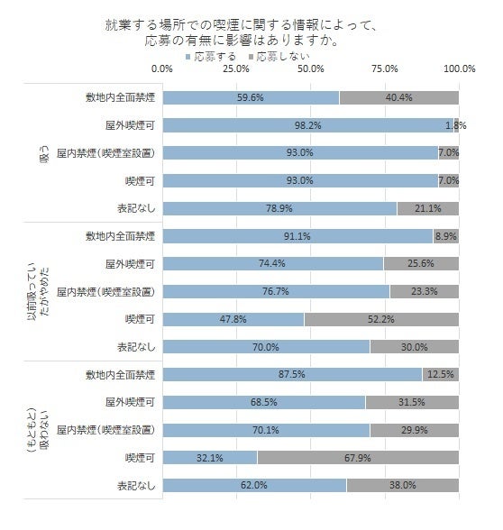喫煙志向のほか、就業する場所での禁煙に関する情報によって、応募の有無に影響があるかもきいた。なおこの時、応募先の他諸条件は希望がかなっているものとした。