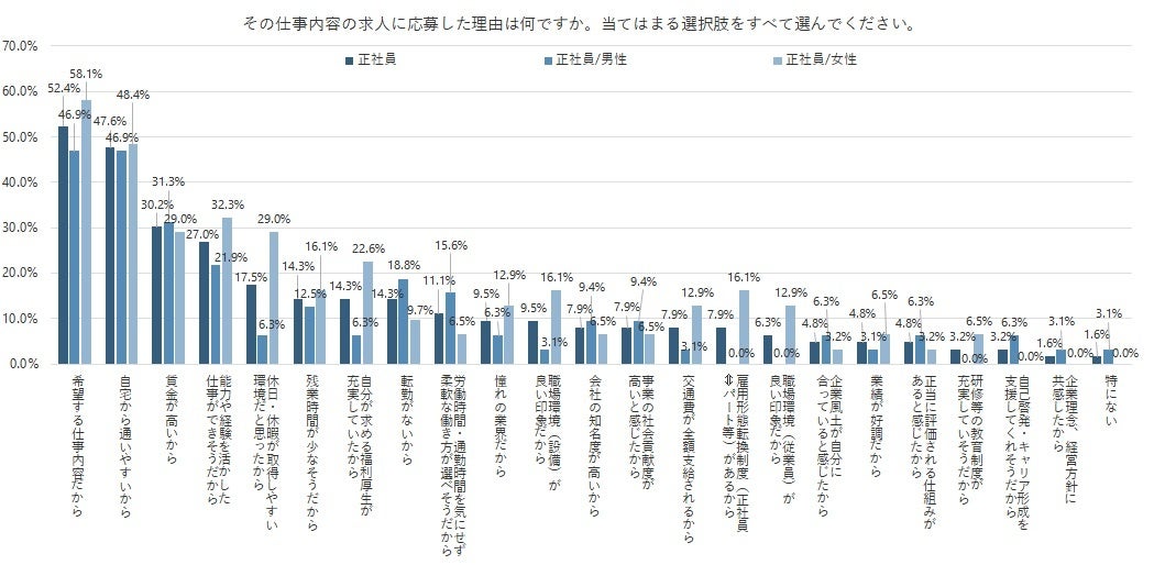 求人に応募した、正社員雇用を希望する人に、自身が応募した求人を選んだ理由をきいた(複数回答)。最も多かったのは「希望する仕事内容だから」の52.4%、次いで「自宅から通いやすいから」が47.6%、「賃金が高いから」が30.2%となった。