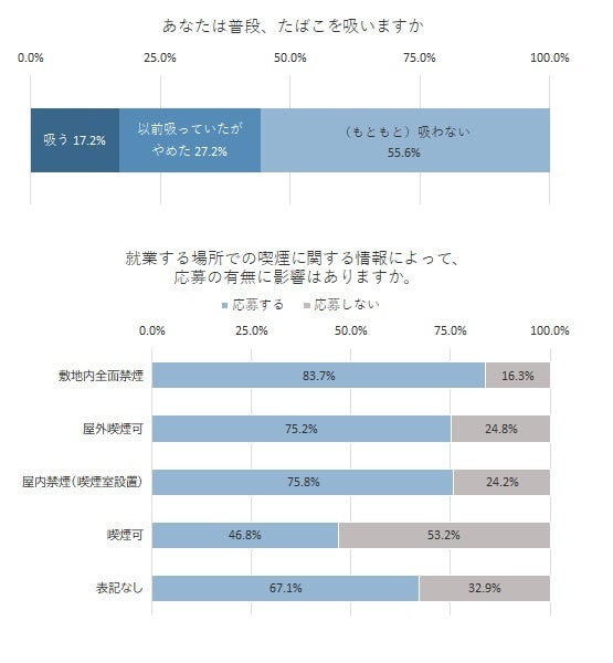 就業場所での喫煙情報による応募意向への影響、「応募する」が最も多かったのは「敷地内全面禁煙」83.7%