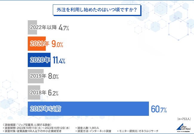 続いて、「外注を利用し始めたのはいつ頃ですか?」と質問したところ、『2017年以前(60.7%)』と回答した方が最も多く、次いで『2020年(11.4%)』『2021年(9.0%)』と続きました。