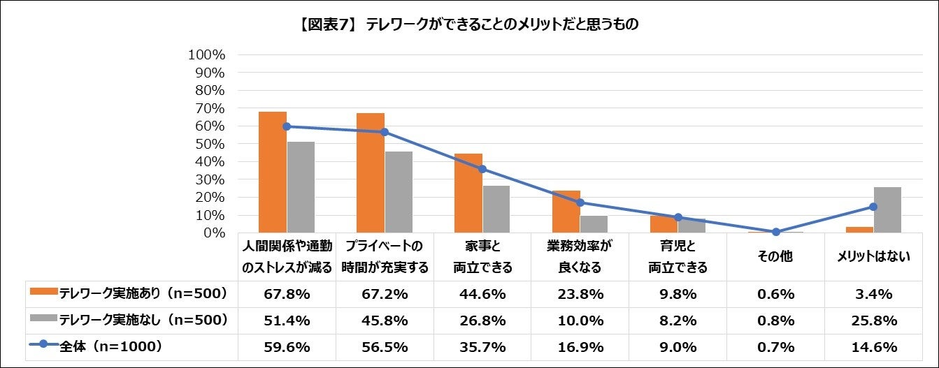 テレワークのメリットを、テレワーク未実施者含めお聞きしました。その結果、最も多いのは「人間関係や通勤のストレスが減る」となり59.6%が回答しました。次いで、「プライベートの時間が充実する」となり56.5%と半数以上が回答しています。どの項目もテレワーク実施者が多く回答しており、そのメリットを実感しているようです(図表7)。