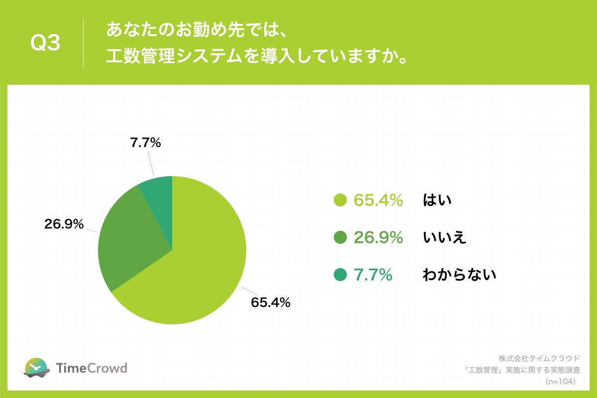 「Q3.あなたのお勤め先では、工数管理システムを導入していますか。」(n=104)と質問したところ、「はい」が65.4%、「いいえ」が26.9%という回答となりました。