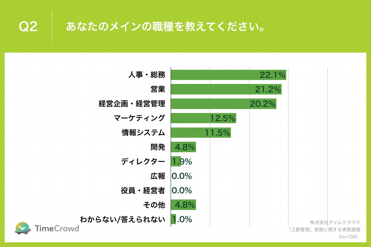 「Q2.あなたのメインの職種を教えてください。」(n=104)と質問したところ、「人事・総務」が22.1%、「営業」が21.2%という回答となりました。