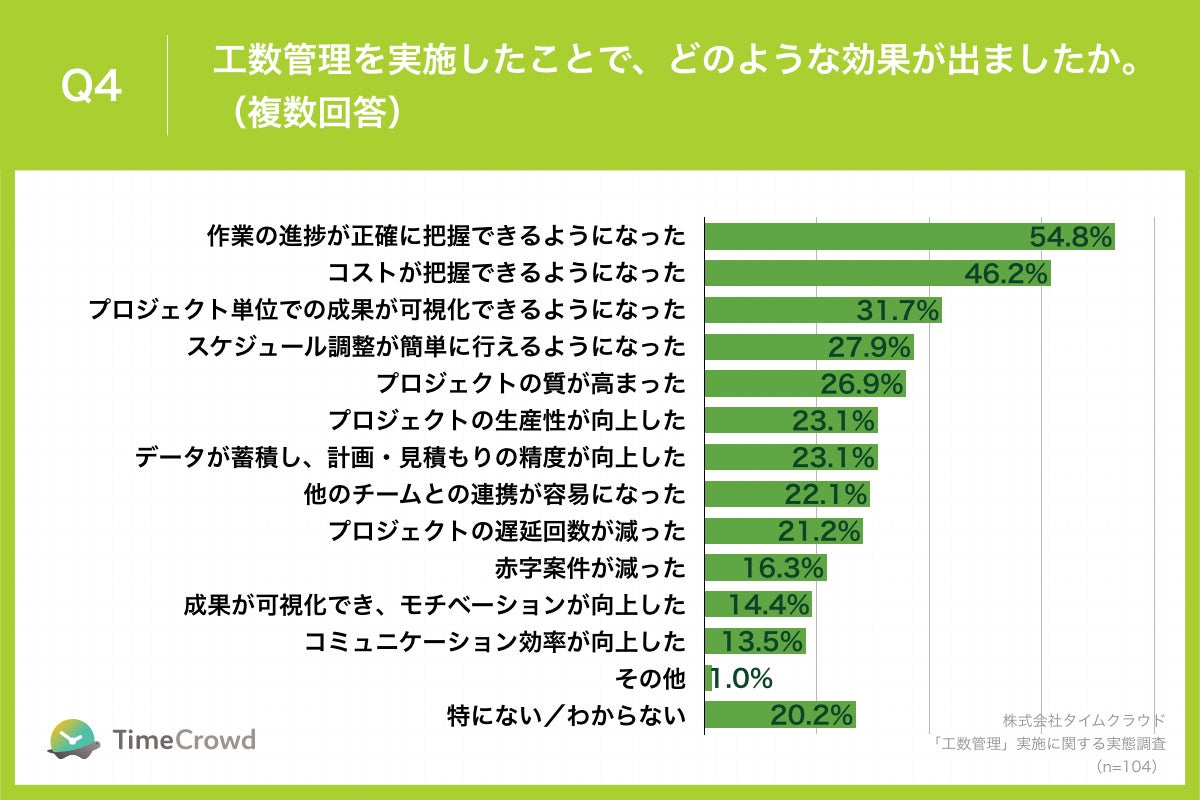 「Q4.工数管理を実施したことで、どのような効果が出ましたか。(複数回答)」(n=104)と質問したところ、「作業の進捗が正確に把握できるようになった」が54.8%、「コストが把握できるようになった」が46.2%、「プロジェクト単位での成果が可視化できるようになった」が31.7%という回答となりました。