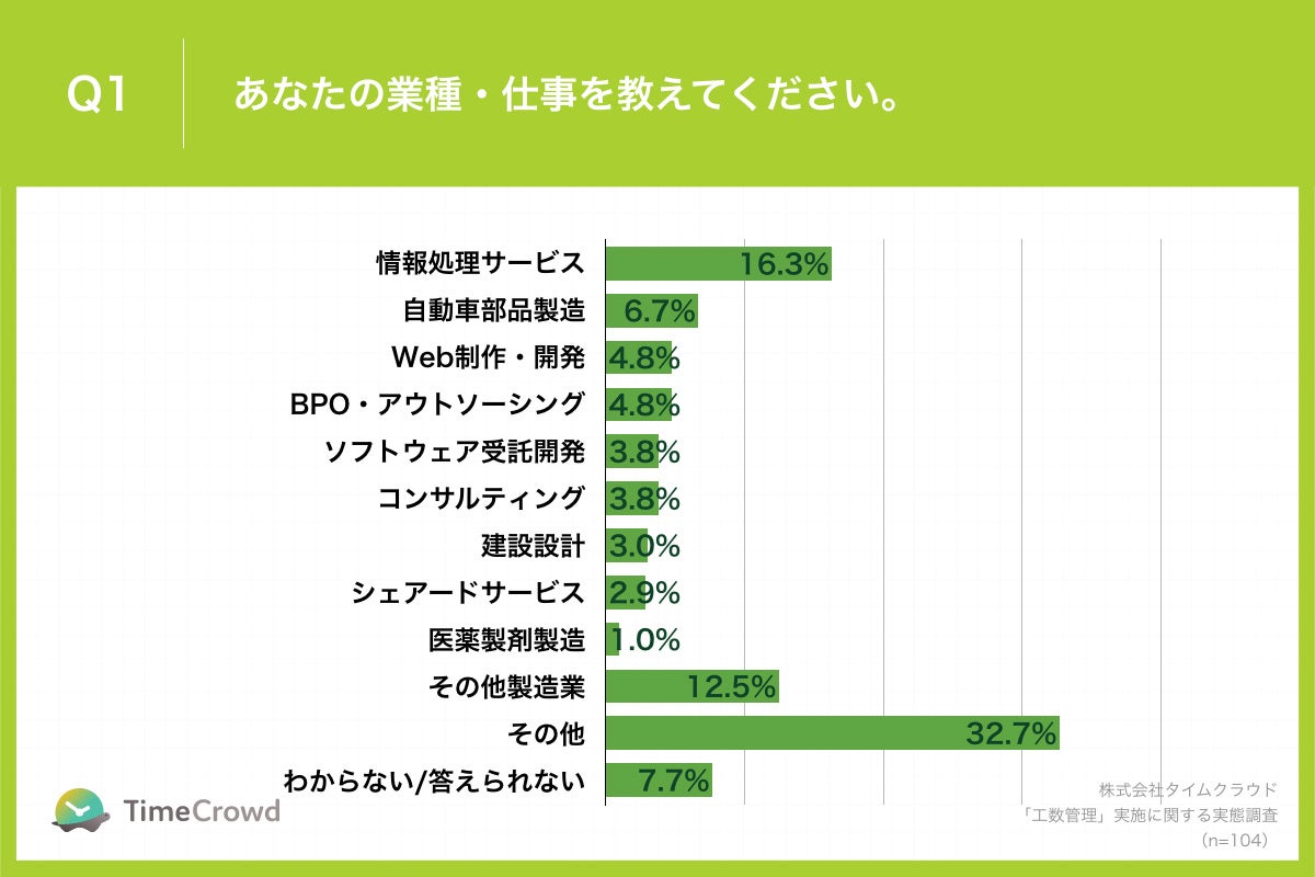 「Q1.あなたの業種・仕事を教えてください。」(n=104)と質問したところ、「情報処理サービス」が16.3%、「その他製造業」が12.5%という回答となりました。