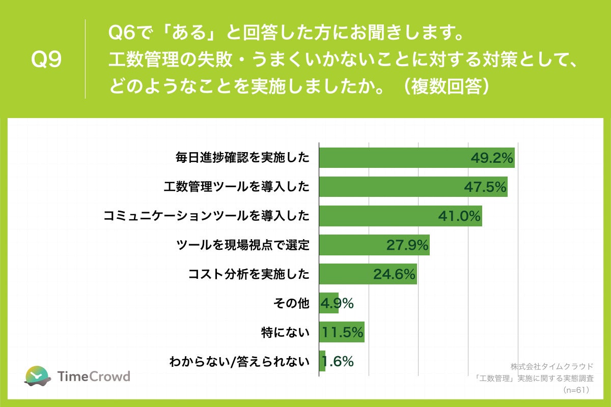 Q6で「ある」と回答した方に、「Q9.工数管理の失敗・うまくいかないことに対する対策として、どのようなことを実施しましたか。(複数回答)」(n=61)と質問したところ、「毎日進捗確認を実施した」が49.2%、「工数管理ツールを導入した」が47.5%、「コミュニケーションツールを導入した」が41.0%という回答となりました。