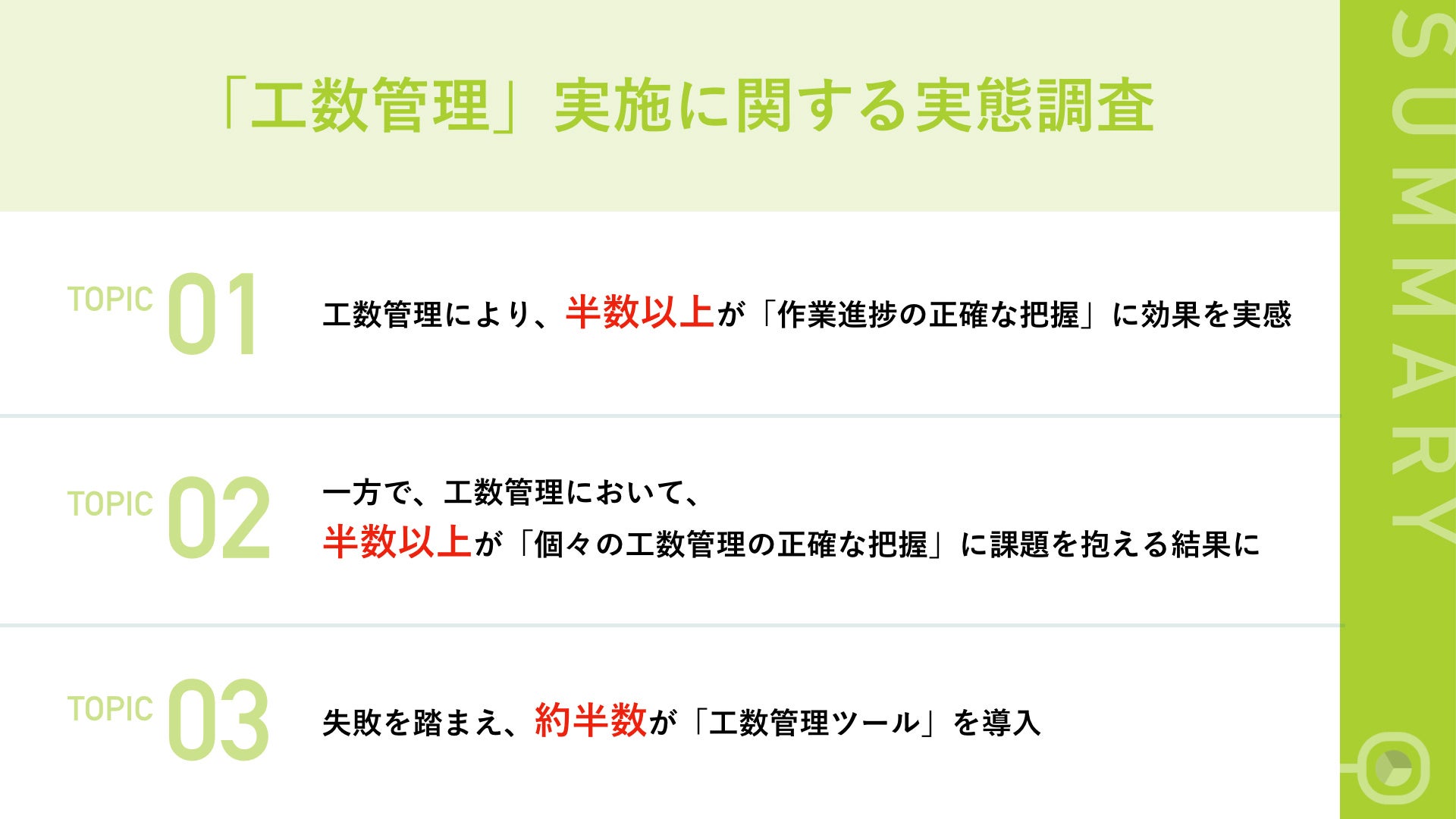 工数管理において、管理業務や入力自体に時間がかかってしまう傾向が多い結果となり、いかに簡単にシンプルかつ有効的に管理できるかという工数管理ツールの選別も成功させる秘けつとなるようです。また、現場での入力作業においても、分かりやすいツールでなければ入力作業が煩雑となり、プロジェクトの進捗に誤差が生じやすくなります。管理者だけが便利だと感じるツールでは、工数管理の精度に問題が出てくることから、プロジェクトに関わる人員全てが共通の目的で動けるような分かりやすいツールが「工数管理」に求められる重要なポイントなのではないでしょうか。