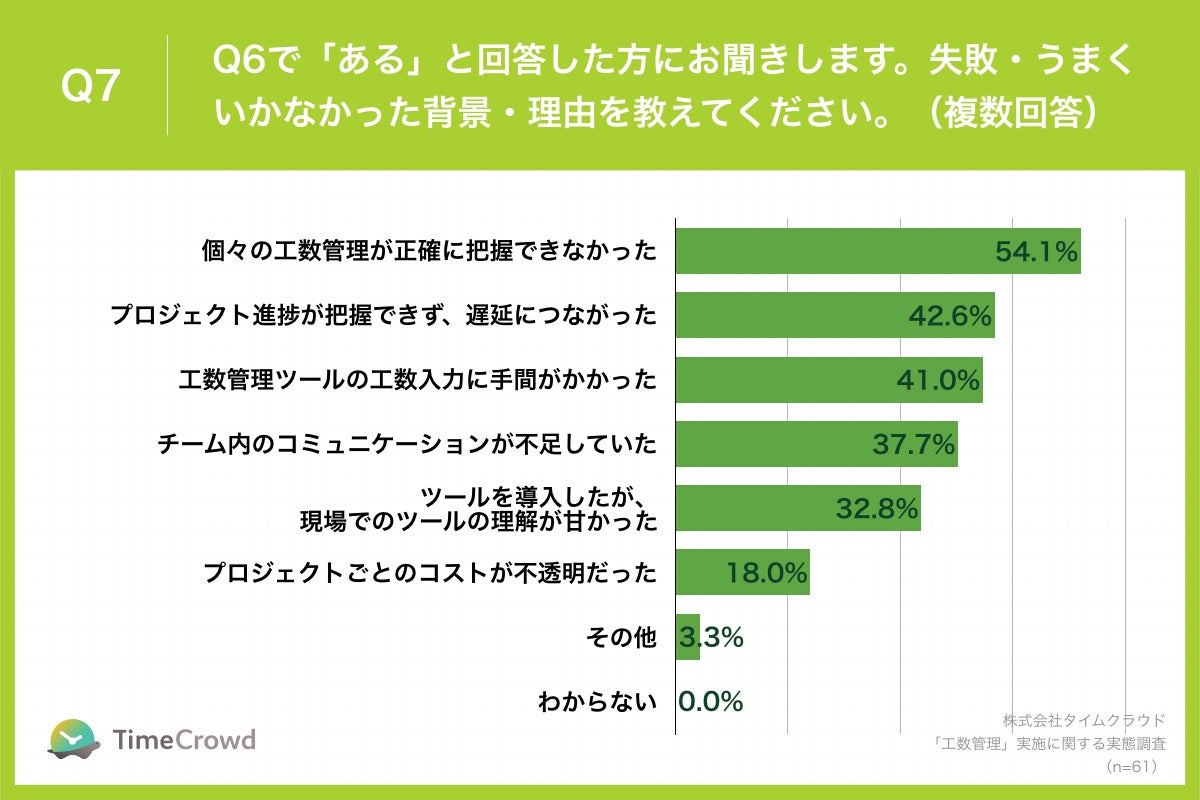 Q6で「ある」と回答した方に、「Q7.失敗・うまくいかなかった背景・理由を教えてください。(複数回答)」(n=61)と質問したところ、「個々の工数管理が正確に把握できなかった」が54.1%、「プロジェクト進捗が把握できず、遅延につながった」が42.6%、「工数管理ツールの工数入力に手間がかかった」が41.0%という回答となりました。