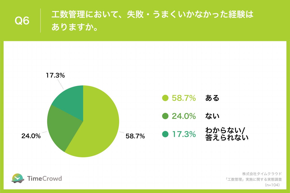 「Q6.工数管理において、失敗・うまくいかなかった経験はありますか。」(n=104)と質問したところ、「ある」が58.7%、「ない」が24.0%という回答となりました。