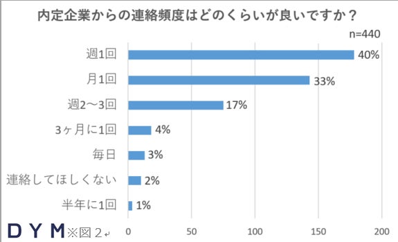 「内定企業からの連絡頻度はどのくらいが良いですか?」という設問に対し最も多かったのが「週1回」178人(40%)2位が「月1回」143人(33%)3位が「週2~3回」75人(17%)という結果になりました。90%の学生が月に1回以上の連絡を希望する結果となりました。(※図2)