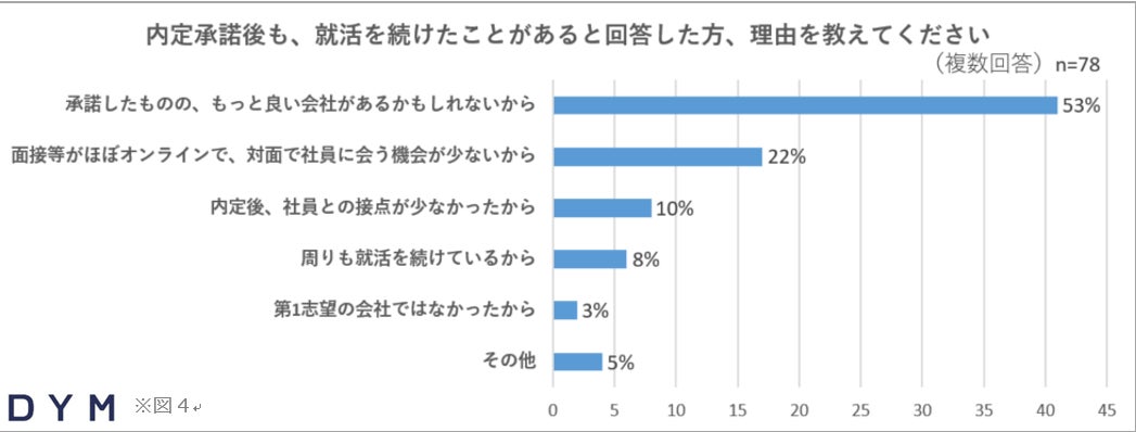 「内定承諾後も、就活を続けたことはありますか?」という質問で内定保有者のうち、43%が「ある」と回答しました。「内定承諾後も、就活を続けたことがあると回答した方、理由を教えてください」という質問に対し、「承諾したものの、もっと良い会社があるかもしれないから」が41人(53%)で1位という結果になりました。2位は「面接等がほぼオンラインで、対面で社員に会う機会が少ないから」が17人(22%)、3位は「内定後、社員との接点が少なかったから」8人(10%)という結果となりました。2位・3位の理由より、コロナ禍で選考等のオンライン化が当たり前となり、企業人事等と対面での接触が減ったことが、内定承諾後も就活を続ける要因ということが見受けられました。人事担当者からの定期的な連絡や、対面での手厚いフォローが内定辞退防止の鍵になりそうです。(※図4)