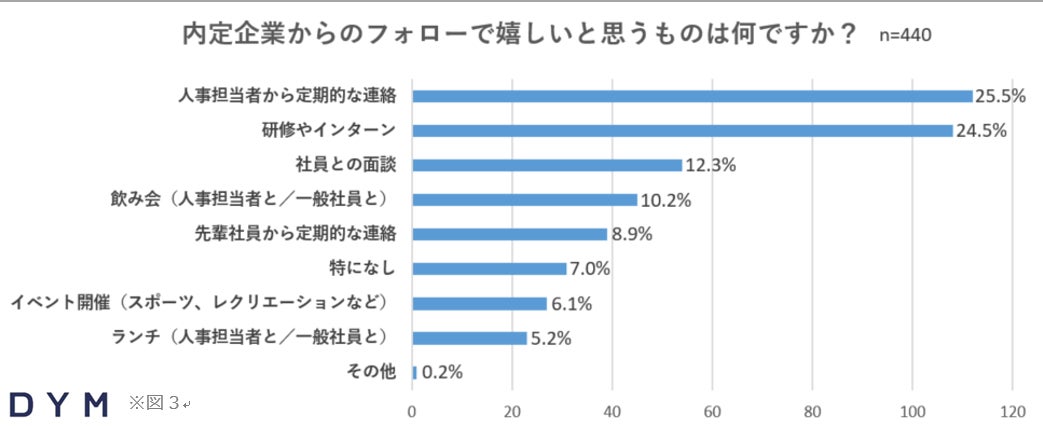 また、「内定企業からのフォローで嬉しいと思うものは何ですか?」というアンケートを実施したところ、「人事担当者から定期的な連絡」が112人(25.5%)で1位、次いで「研修やインターン」が108人(24.5%)で2位となりました。同アンケートを2019年8月20日~2020年1月7日260人にとった際には、1位が「特になし」78人(約30%)という結果から、コロナ禍を経て、手厚いフォローを好む学生が増えたことが分かりました。(※図3)