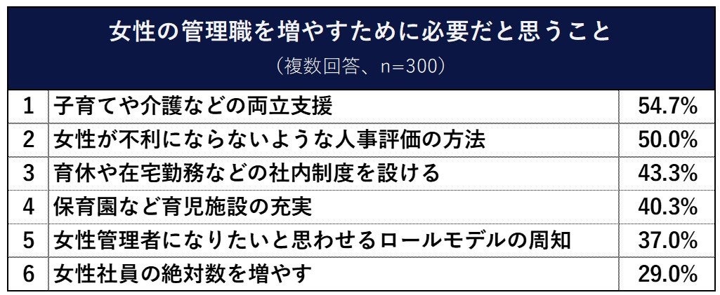 Q1で女性の管理職になりたいという割合が男性よりも低かったことから、やはり女性にとって管理職になることのハードルは男性よりも高いようです。このことを踏まえ、女性の管理職を増やすためには何が必要かを聞いたところ、「子育てや介護などの両立支援」が54.7%と最も高く、「女性が不利にならないような人事評価の方法」50.0%、「育休や在宅勤務などの社内制度を設ける」43.3%と続きました。