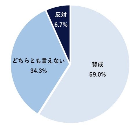 日本は国際的に女性管理職の割合が低いという現状があり、国として「女性活躍」を目標に掲げ女性管理職を増やす社会全体の動きがあります。そこで、女性管理職を増やす社会全体の動きについて、その賛否を聞いたところ、「賛成(やや賛成も含む)」59.0%、「どちらとも言えない」34.3%、「反対(やや反対も含む)」6.7%という結果となりました。多様性が叫ばれる昨今で、賛成以外の割合が多いような印象もありますが、次の設問の賛否の理由を紐解くと、賛成以外の方には、そもそも性別で区別することの意味を問うている方や、女性を管理職へ登用してもシステムが追いついていないといった声があり、根本から否定的な方は多くありませんでした。