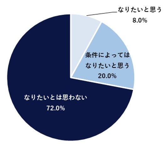 現在管理職ではない方に「管理職になりたいか」聞いたところ、「なりたいと思う」と回答したのは8.0%で、「条件(給与面等)によってはなりたいと思う」が20.0%、「なりたいとは思わない」が72.0%となりました。男女別にみると、男性で管理職に「なりたいと思う」と回答したのは12.0%だったのに対し、女性はわずか4.0%でした。