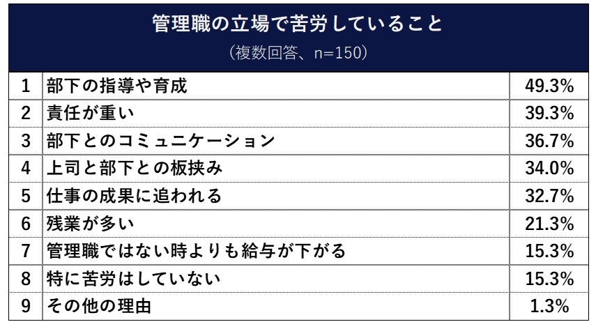 一方、現在管理職の方に、管理職をする上での苦労を聞いたところ、「部下の指導や育成」が49.3%と最も高く、「責任が重い」が39.3%、「部下とのコミュニケーション」が36.7%、「上司と部下との板挟み」が34.0%と続きました。現在、管理職ではない方で上位だった「責任の重さ」ももちろんあるようですが、実際には上司や部下との“人間関係”が最も苦労しているようです。