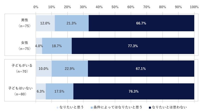 さらに「子どもの有無」での内訳を見ると、子どもがいる方が管理職に「なりたいと思う」と回答したのは10.0%だったのに対し、子どもがいない方は6.3%という結果に。子どもがいるから頑張りたいというモチベーションが明確にある方の方が管理職になりたい傾向にあるようです。