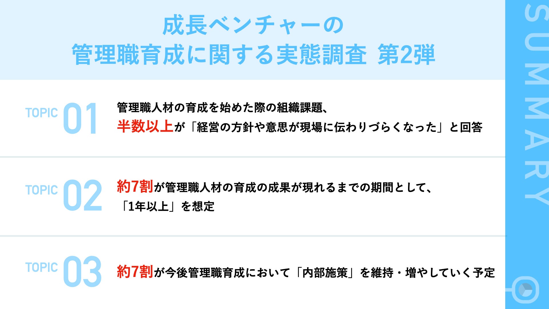 前回の調査では、「成長ベンチャーの多くが管理職人材の育成に注力し、業績へのインパクトを実感している」という結果が見られ、今回の調査では、注力し始めたタイミングの組織規模、具体的に起きていた課題、成果が現れるまでの想定期間など、管理職人材の育成を進める上で押さえておきたいポイントをより捉えることができました。