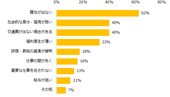 派遣で働いたことがある方に派遣で働くデメリットを伺うと、トップは「賞与が出ない」(62%)でした。次いで「社会的な身分・信用が弱い」「交通費が出ない場合がある」(同率40%)が続きました。それぞれの回答においてデメリットだと感じる理由も紹介します。