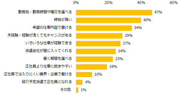 派遣で働いたことがある方に、派遣で働くメリットを伺うと、第1位は「勤務地・勤務時間や曜日を選べる」(47%)でした。次いで「時給が高い」(40%)、「希望の仕事内容で働ける」(34%)が続きました。それぞれの回答において、メリットだと感じる理由も紹介します。
