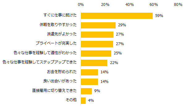 派遣で働いたことがある方に、今まで「派遣で良かった」と思ったことを伺うと、第1位は「すぐに仕事に就けた」(59%)で、第2位以下の回答と倍以上の差をつける結果となりました。派遣で良かったと感じたエピソードや、派遣未経験者に向けた、派遣で働く前に準備しておいたほうが良いことに関するコメントも紹介します。