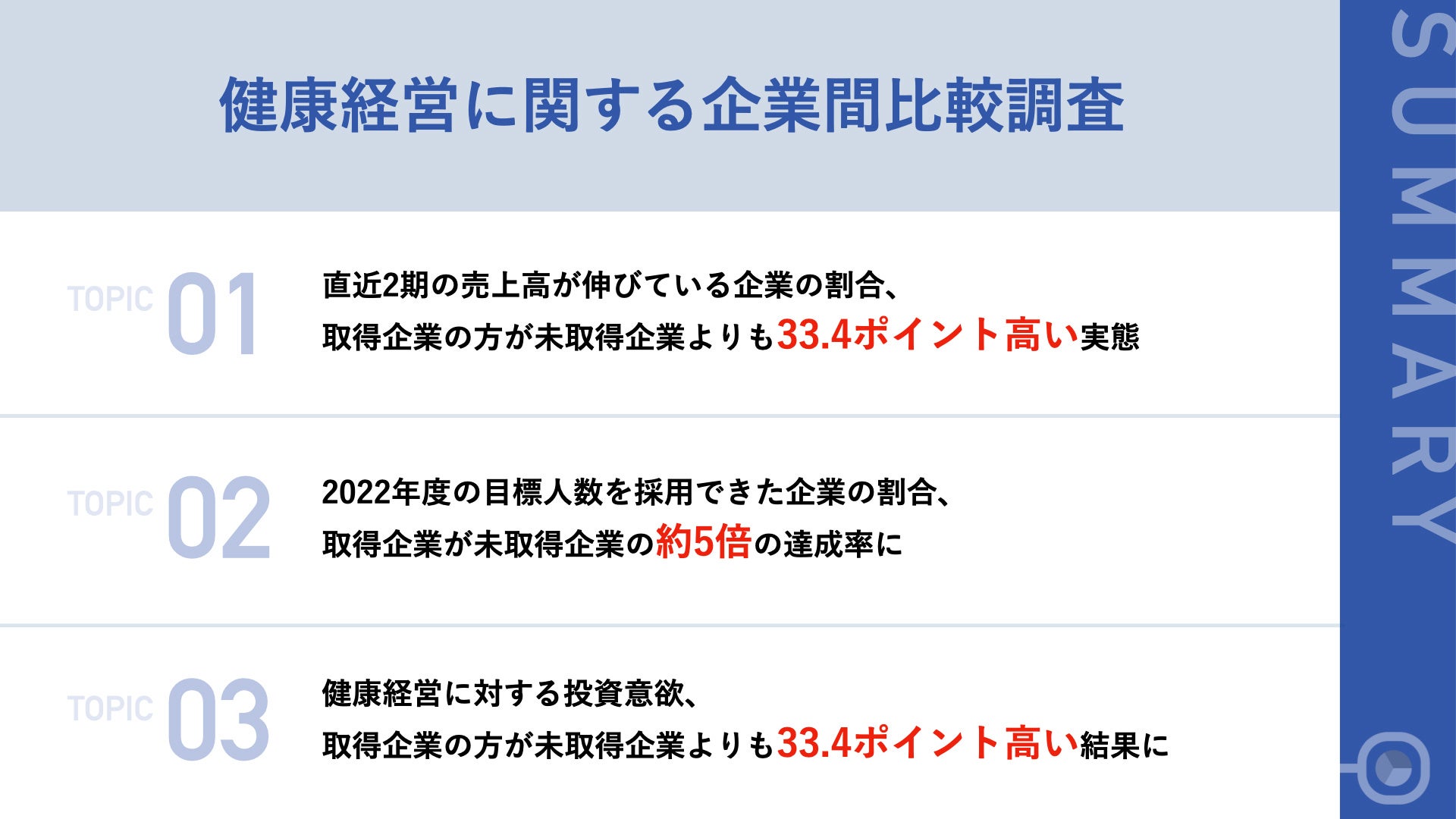 - 直近2期の売上高が伸びている企業の割合、「健康経営優良法人」取得企業の方が、未取得企業よりも33.4ポイント高い実態