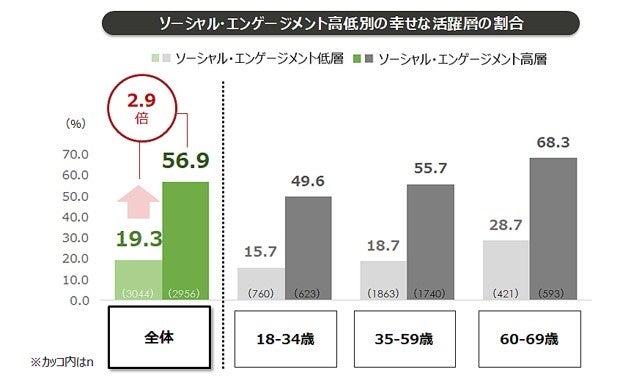 【2】 ソーシャル・エンゲージメントが高い層は、低い層と比べ幸せな活躍をしている人の割合が2.9倍。