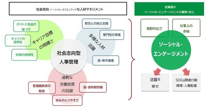 また、ソーシャル・エンゲージメントには企業の人事管理も影響する。キャリア目標を明確化することや、長時間労働を防止することなどとプラスの関連が見られた。また、業務命令による異動・転勤の多さはマイナスに作用しており、伝統的な日本の配置転換の在り方が、就業者の社会的関心を下げている可能性も示唆された。