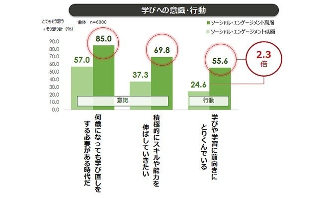 【3】 ソーシャル・エンゲージメントが高い層は、低い層と比べ環境配慮や人権配慮行動を行っている割合が高い。また、学びへの前向きな行動も2.3倍見られる。