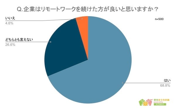今回不動産メディア「幸せおうち計画」を運営する、株式会社AZWAY(本社:東京都豊島区、代表取締役:井口梓美)は、10代から60代以上までの男女500人を対象に「リモートワークを今も続けているか」についてアンケートを実施しました。
