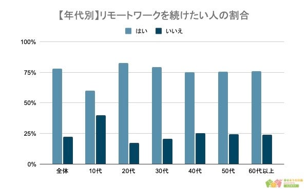 また「リモートワークを続けたいか」聞いたところ、「はい」と答えた人は389人、「いいえ」と答えた人は111人という結果に。年代別にみると20代の人がわずかに多いものの、その他の世代とあまり大差はなく、ほとんど横並びであることがわかります。