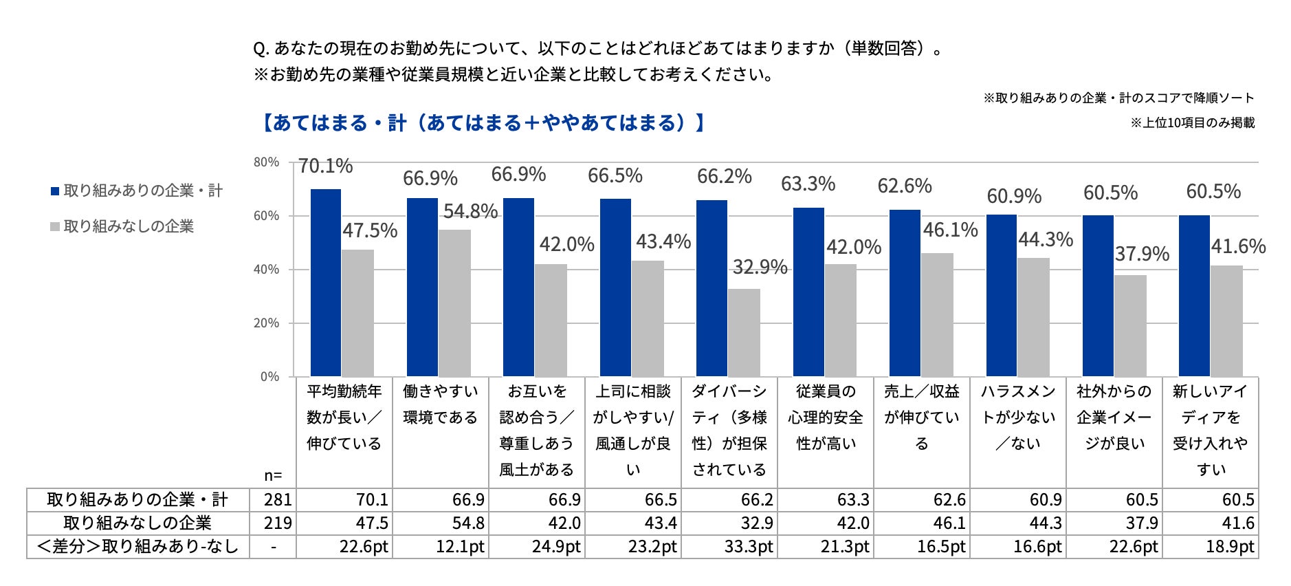 また、取り組みを実施している企業と実施していない企業で最も差が大きかったのは、「ダイバーシティ(多様性)が担保されている」で、取り組み企業(66.2%)は取り組んでいない企業(32.9%)の約2倍、次いで差が大きかったのは「お互いを認め合う/尊重し合う風土がある」で、取り組み企業(66.9%)が取り組んでいない企業(42.0%)の約1.6倍でした。