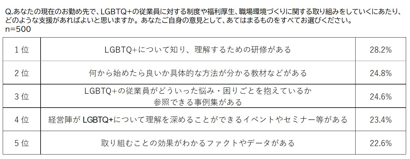 既に取り組んでいる企業を含む全体では「LGBTQ+について知り、理解するための研修がある」(28.2%)が最多、次いで「何から始めたら良いか具体的な方法が分かる教材などがある」(24.8%)が2位。