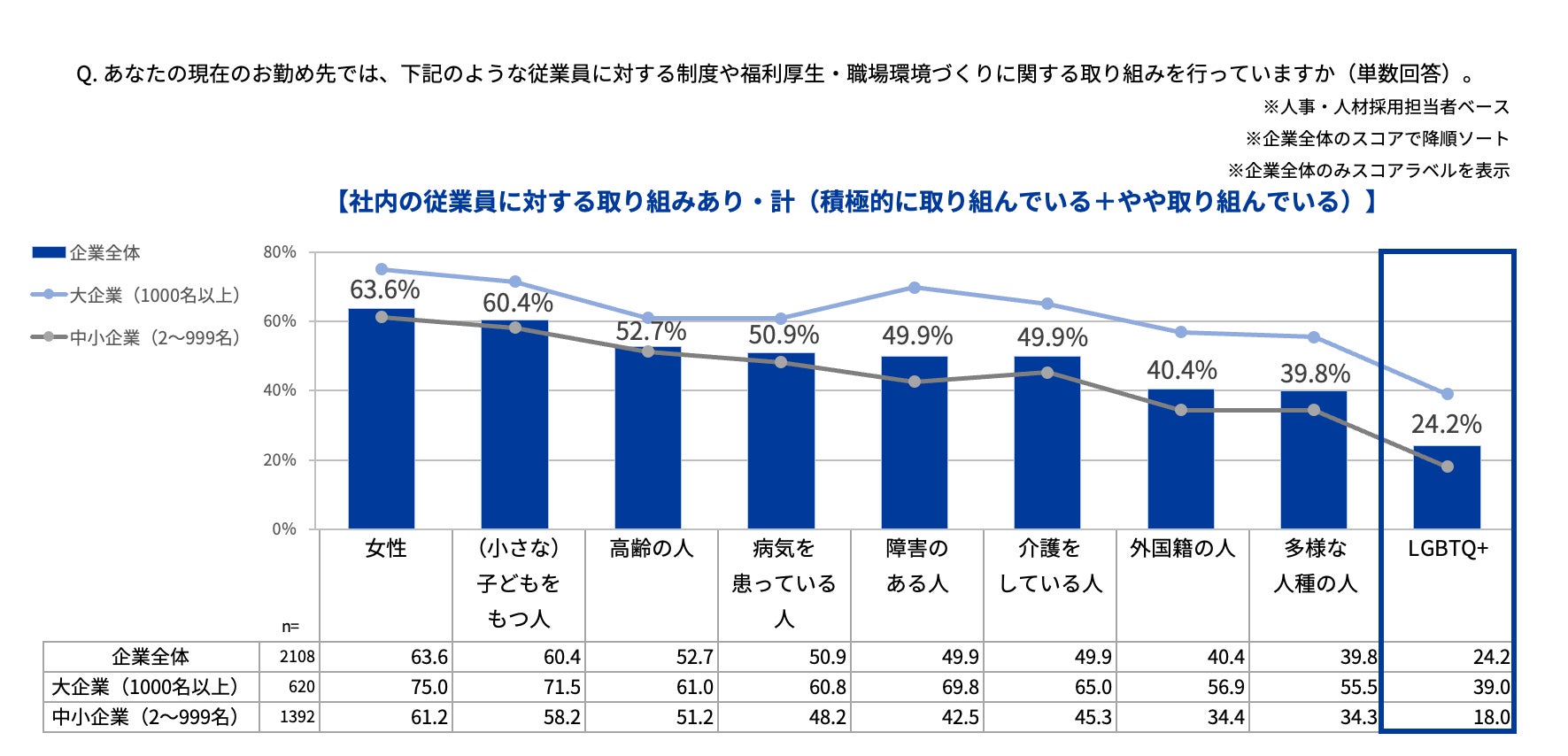 LGBTQ+当事者の従業員を支援する取り組みを行っている企業は全体の24.2%。大企業では約4割(39.0%)に対し、中小企業は半数の2割以下(18.0%)。
