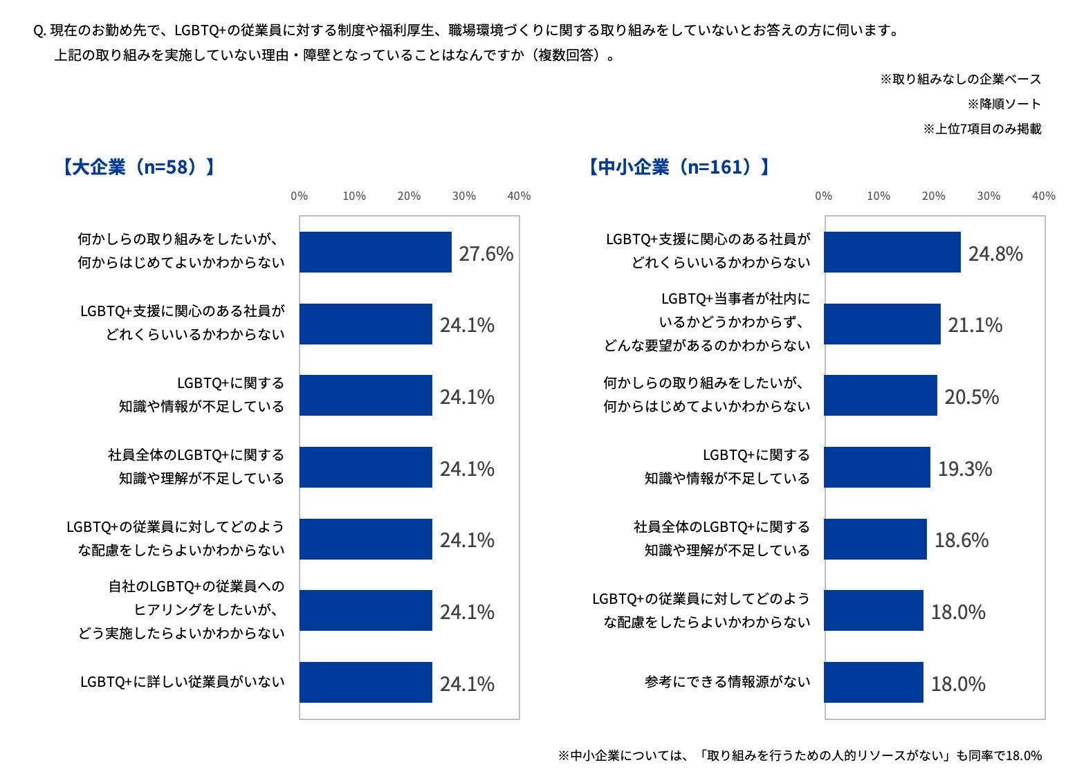 取り組みを実施していない企業にその理由や障壁となっていることを尋ねたところ、大企業では「何かしらの取り組みをしたいが、何からはじめてよいかわからない」(27.6%)がもっとも多く、中小企業(20.5%)の1.3倍でした。中小企業では「LGBTQ+支援に関心のある社員がどれくらいいるかわからない」が24.8%と回答し最多となりました。