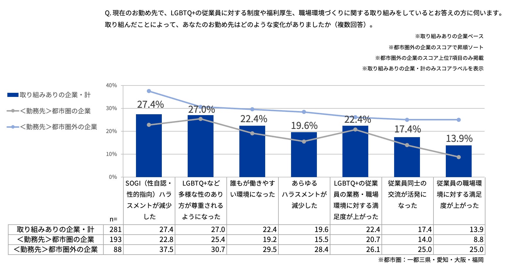 取り組みによる変化は、「SOGI(性自認・性的指向)ハラスメントが減少した」(全体で27.4%)が最も多く、特に都市圏外(37.5%)は都市圏(一都三県・愛知・大阪・福岡)(22.8%)の1.6倍変化を実感。