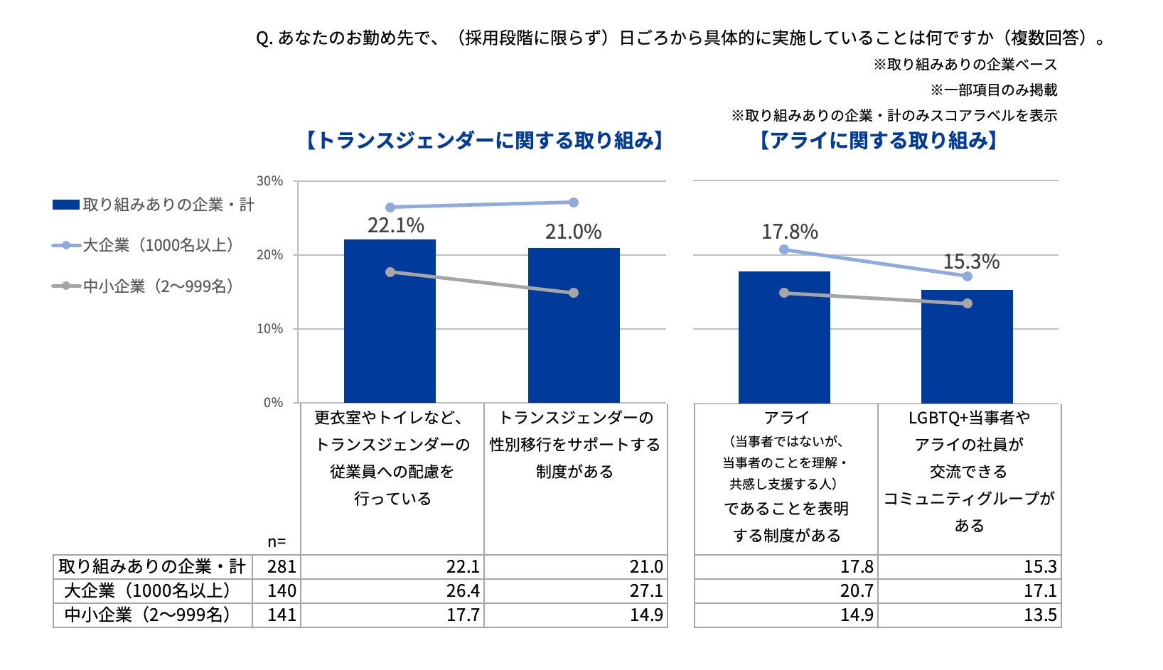 「トランスジェンダーの従業員への配慮を行っている(本人の望むトイレや更衣室の使用、健康診断における個別対応など)」は22.1%。また「トランスジェンダーの性別移行をサポートする制度がある」は21.0%、特に中小企業(14.9%)では少なく、大企業(27.1%)の6割弱に留まる。