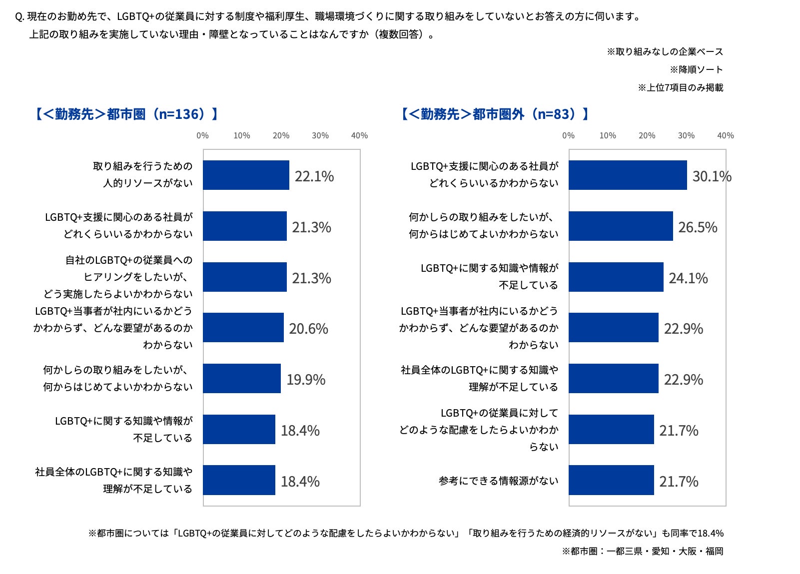 都市圏では、支援に取り組むための人員不足に悩む一方で、地方企業では、LGBTQ+に関する情報が不足していることが特徴的な課題であると考えられます。