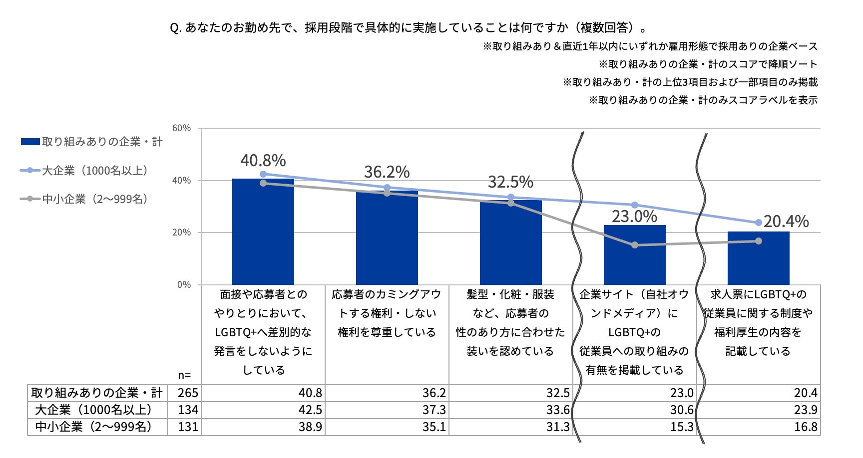 取り組み実施企業のうち、「面接や応募者とのやりとりにおいて、LGBTQ+当事者への差別的な発言をしないようにしている」が40.8%で最多。