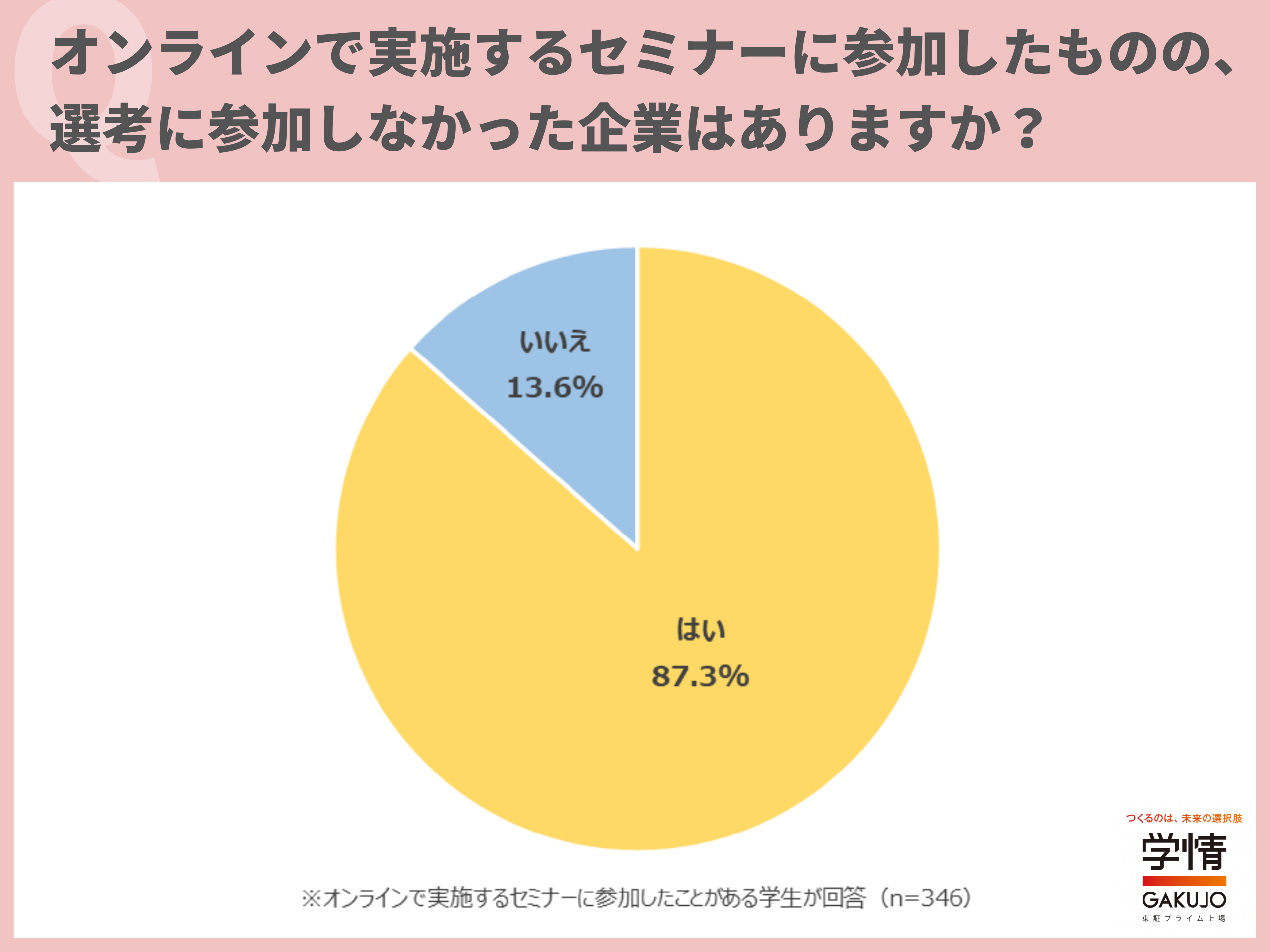 オンラインで実施するセミナーに参加したものの、選考に参加しなかった企業があると回答した学生が、87.3%に上りました。9割に迫る学生が、オンラインのセミナーに参加後、選考に進まなかった経験があることが分かります。