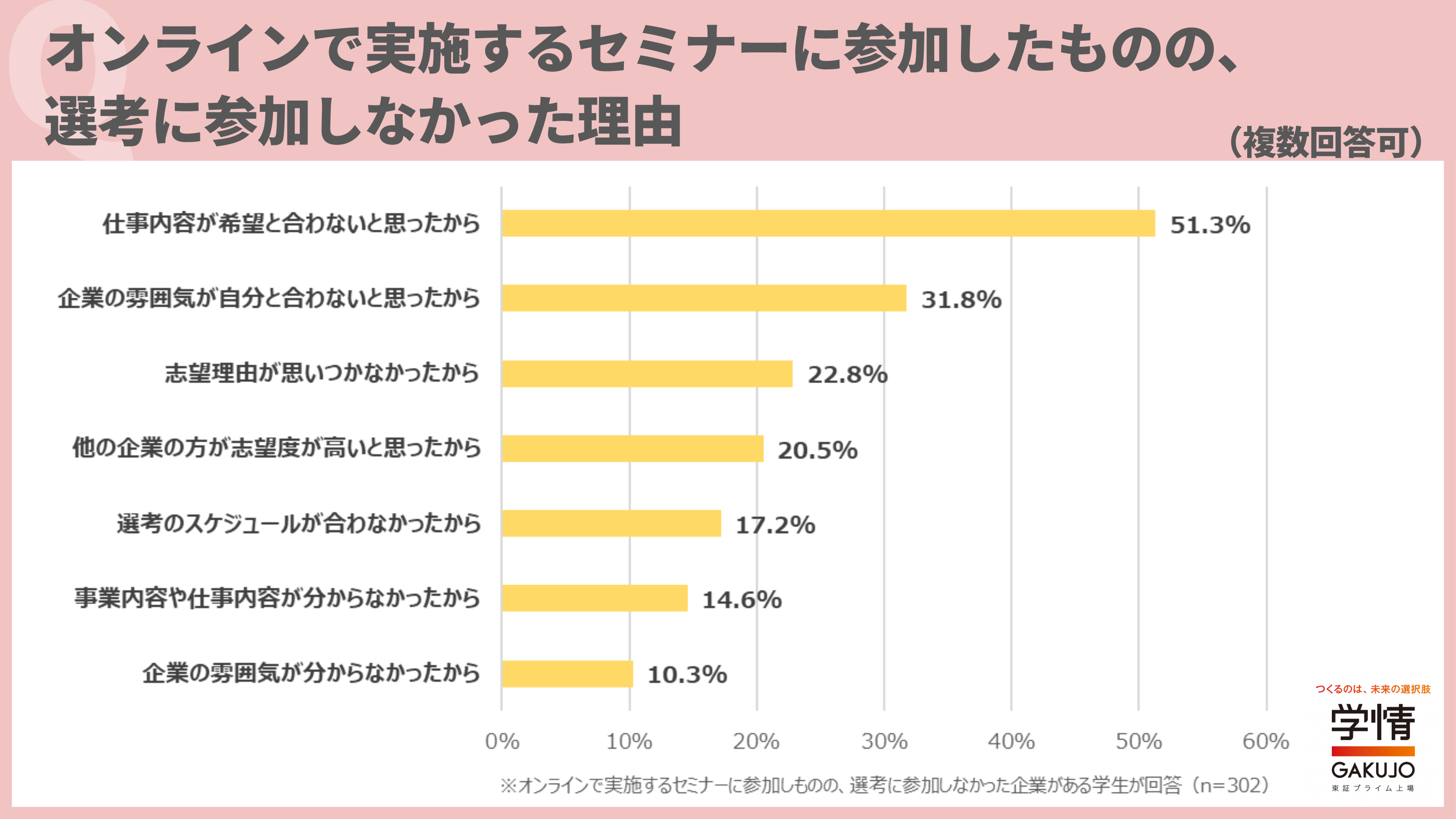 オンラインで実施するセミナーに参加後、選考に進まなかった理由は、「仕事内容が希望と合わないと思ったから」が51.3%で最多。次いで、「企業の雰囲気が自分と合わないと思ったから」31.8%、「志望理由が思いつかなかったから」22.8%が続きました。